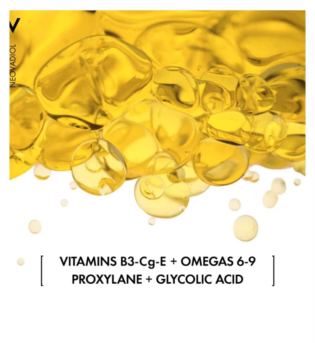 Vichy Volcanic Mineralising Water together with a unique combination of active ingredients; Proxylane, Cassia Seed Extract, a trio of antioxidants (Vitamin B3, Cg and E), Glycolic Acid and skin-nourishing omegas 6-9, powers this lightweight bi-phase serum to help intensely nourish, restore comfort and reveal a radiant, even-looking complexion.